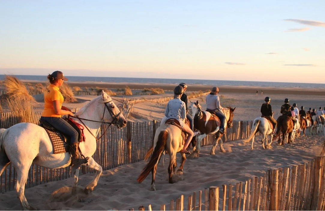 Évadez-vous lors d'une promenade à cheval inoubliable avec les Cabanes de Cacharel. Au départ de ce site légendaire des Saintes-Maries-de-la-Mer, parcourez des paysages sauvages entre étangs et sansouires. Une immersion au pas du cheval pour observer flamants roses et nature préservée, au plus près de l'ADN sauvage de la Camargue.
