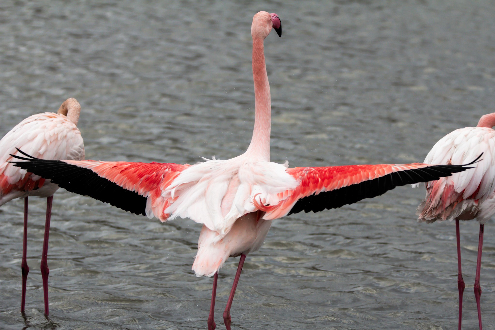 Le "Head-Flagging" : Les flamants dressent le cou et tournent la tête de gauche à droite de manière saccadée et synchronisée.
