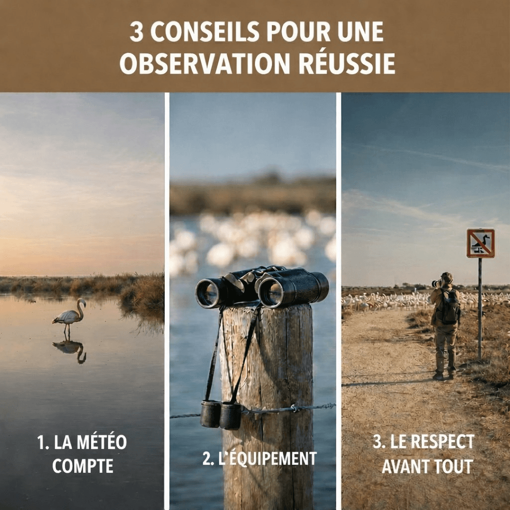 Le respect avant tout : Restez sur les chemins balisés. Un flamant qui s'envole à cause de vous est un flamant qui perd une énergie précieuse pour sa reproduction.